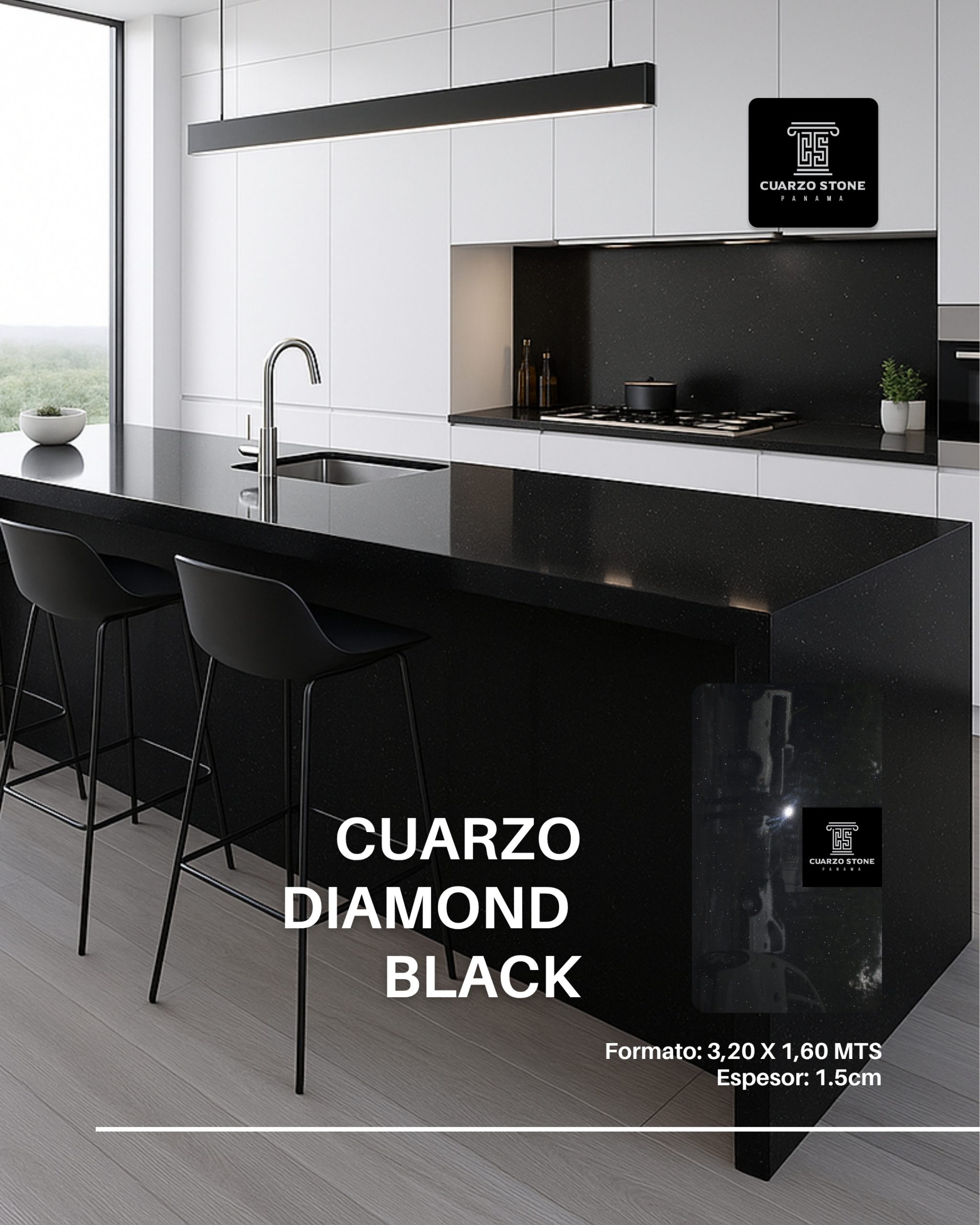 Descubre la elegancia y modernidad del Cuarzo Black Diamond, perfecto para encimeras de cocina, baños y superficies decorativas. Su acabado oscuro con destellos brillantes aporta un toque contemporáneo y sofisticado a cualquier espacio, además de ser altamente resistente a golpes, manchas y calor. Ofrecemos venta de láminas de cuarzo negro estelar y servicio profesional de fabricación e instalación en Panamá, adaptado a tus necesidades y estilo.